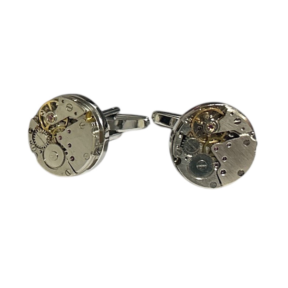 ラウンドシェイプの時計の ムーブメントを使用したカフスボタン ※ムーブメントは動きません ベースカラーーシルバー 素材ーbrass(真鍮) サイズー直径16mm