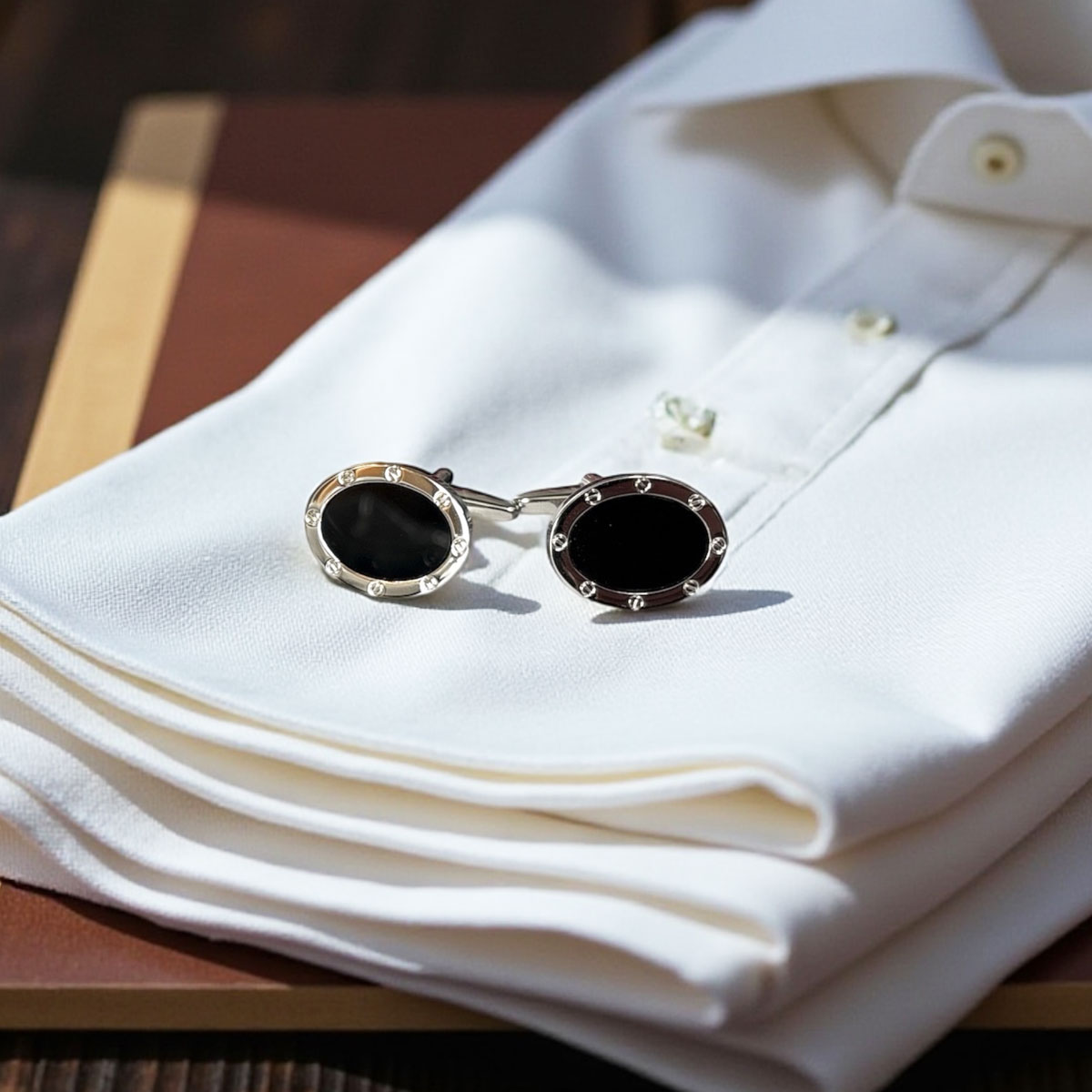 オーバル型のブラックダイヤモンド・スワロフスキーを使用したゴージャスなカフスボタン。 スワロフスキー社はオーストリアのチロルに本社を置く会社であり、 1895年、ダニエル・スワロフスキーが創業しまし…