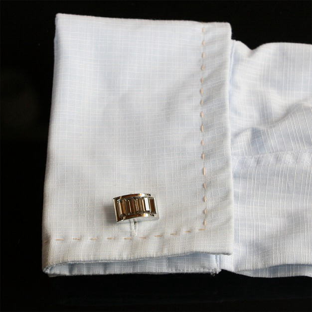 折りたたむと流線型のスティックのような デザインになるクールなカフスボタン。 中央にはブルーチェックがデザインされていますよ