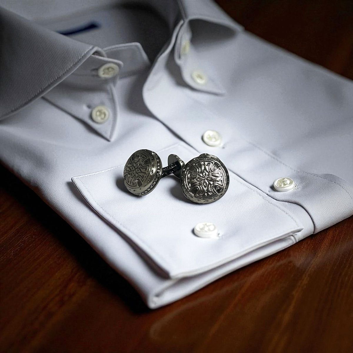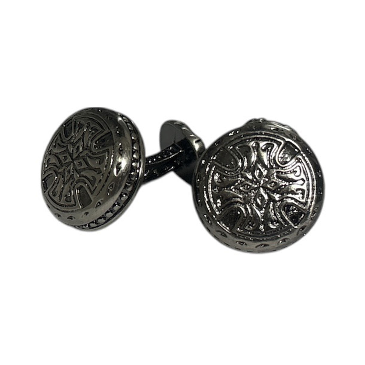 ビンテージ仕上げが施された、ラウンドタイプの カフスボタン。ハートでクロスをかたどった スタイリッシュなデザインですよ。