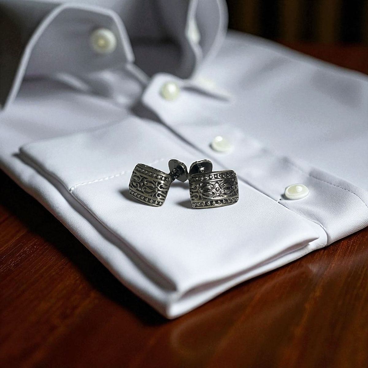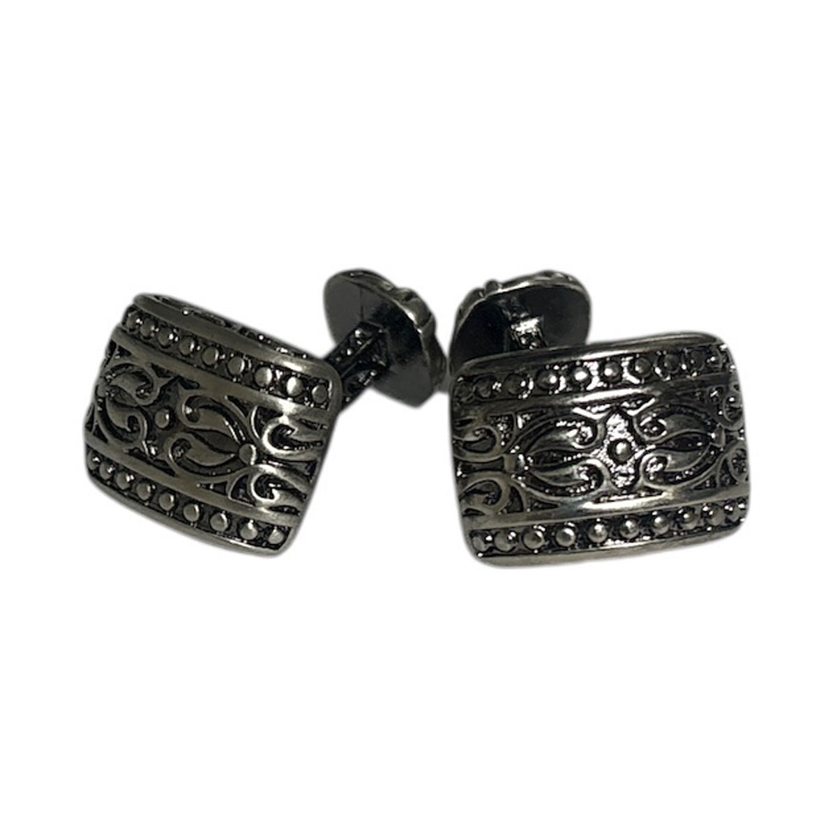 ビンテージ仕上げが施された、スクエアータイプの カフスボタン。細部にまで彫にこだわっている 商品ですよ。