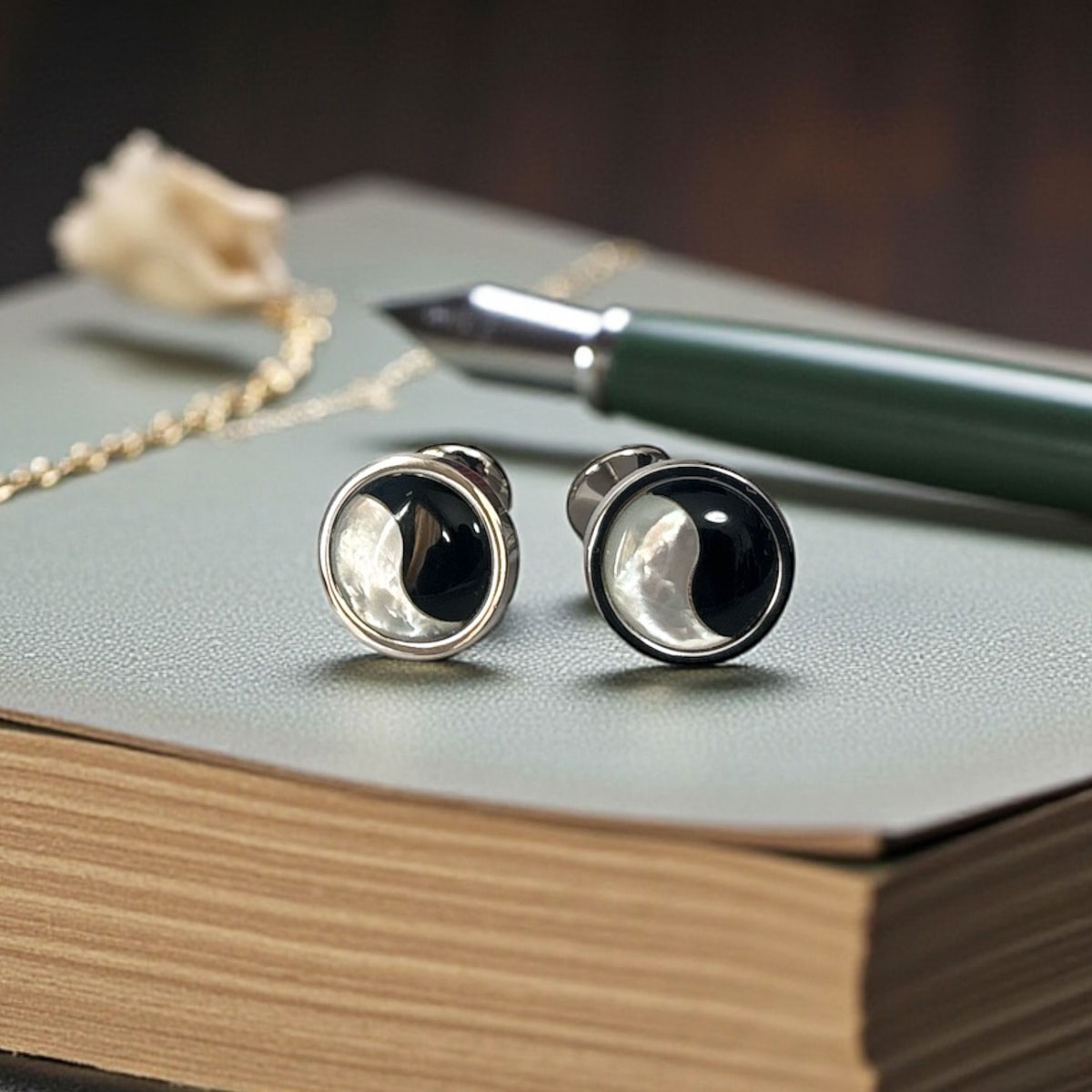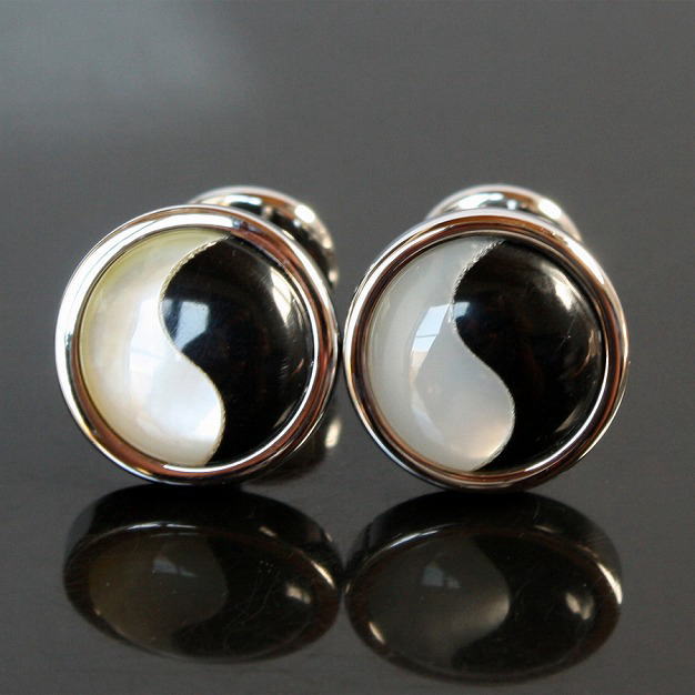 MOP(マザーオブパール)をベースに ブラックオニキスのラインが入ったカフスボタン。 袖口にアクセントにおすすめですよ。