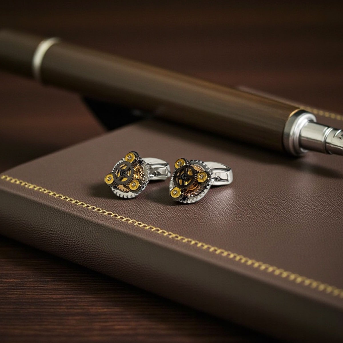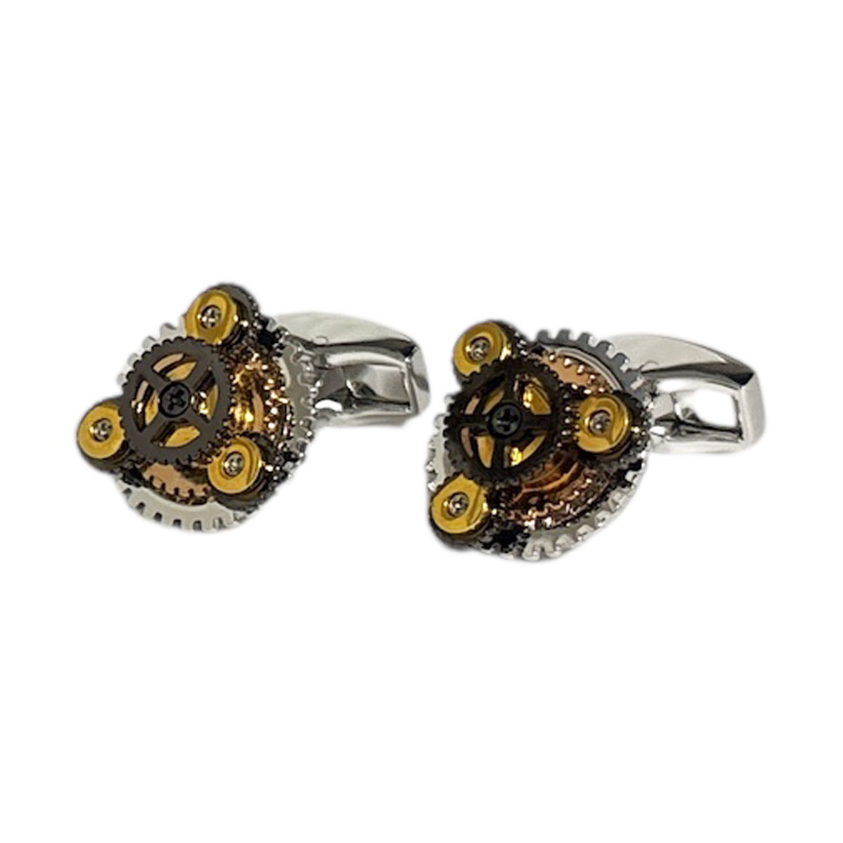 英国で人気のタテオシアンのカフスボタン ガンメタをベースとしたギアモチーフ。 それぞれのギアは回転しますよ♪