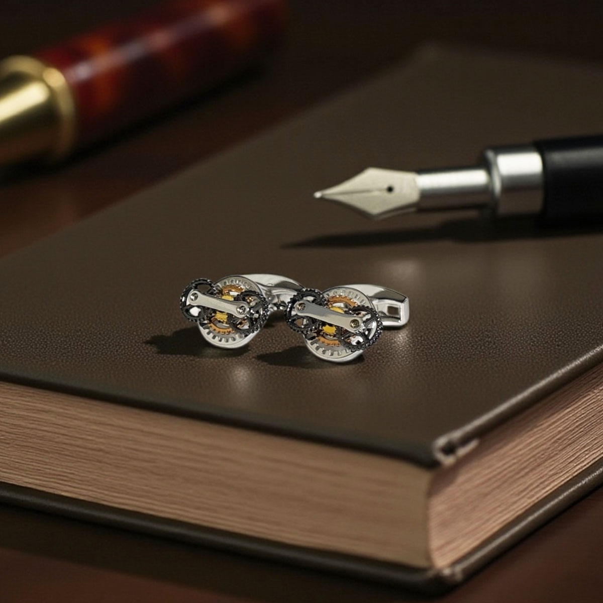 英国で人気のタテオシアンのカフスボタン ガンメタをベースとしたギアモチーフ。 それぞれのギアは回転しますよ♪