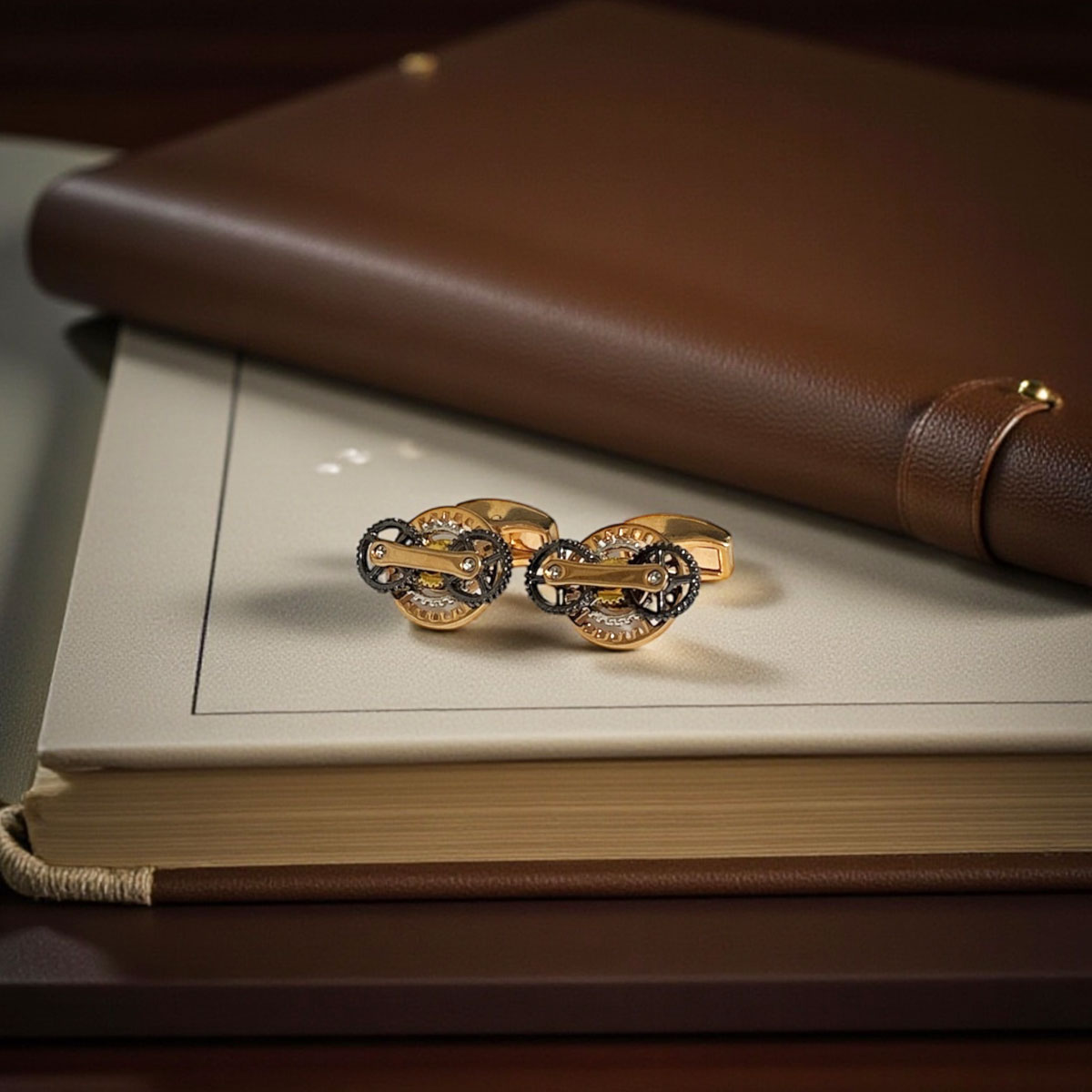 英国で人気のタテオシアンのカフスボタン ガンメタをベースとしたギアモチーフ。 それぞれのギアは回転しますよ♪
