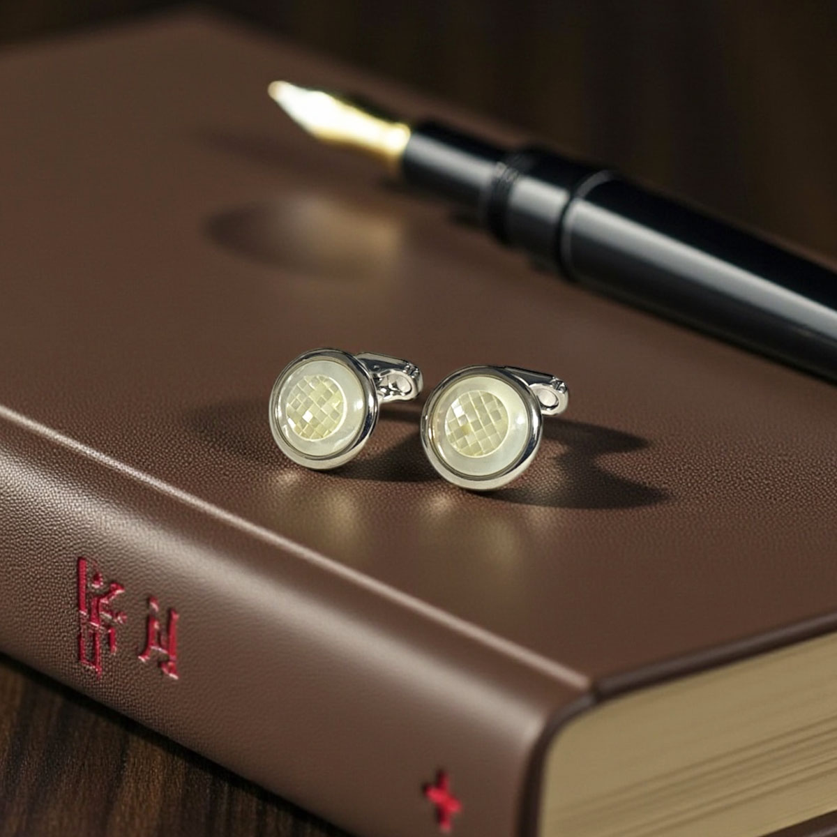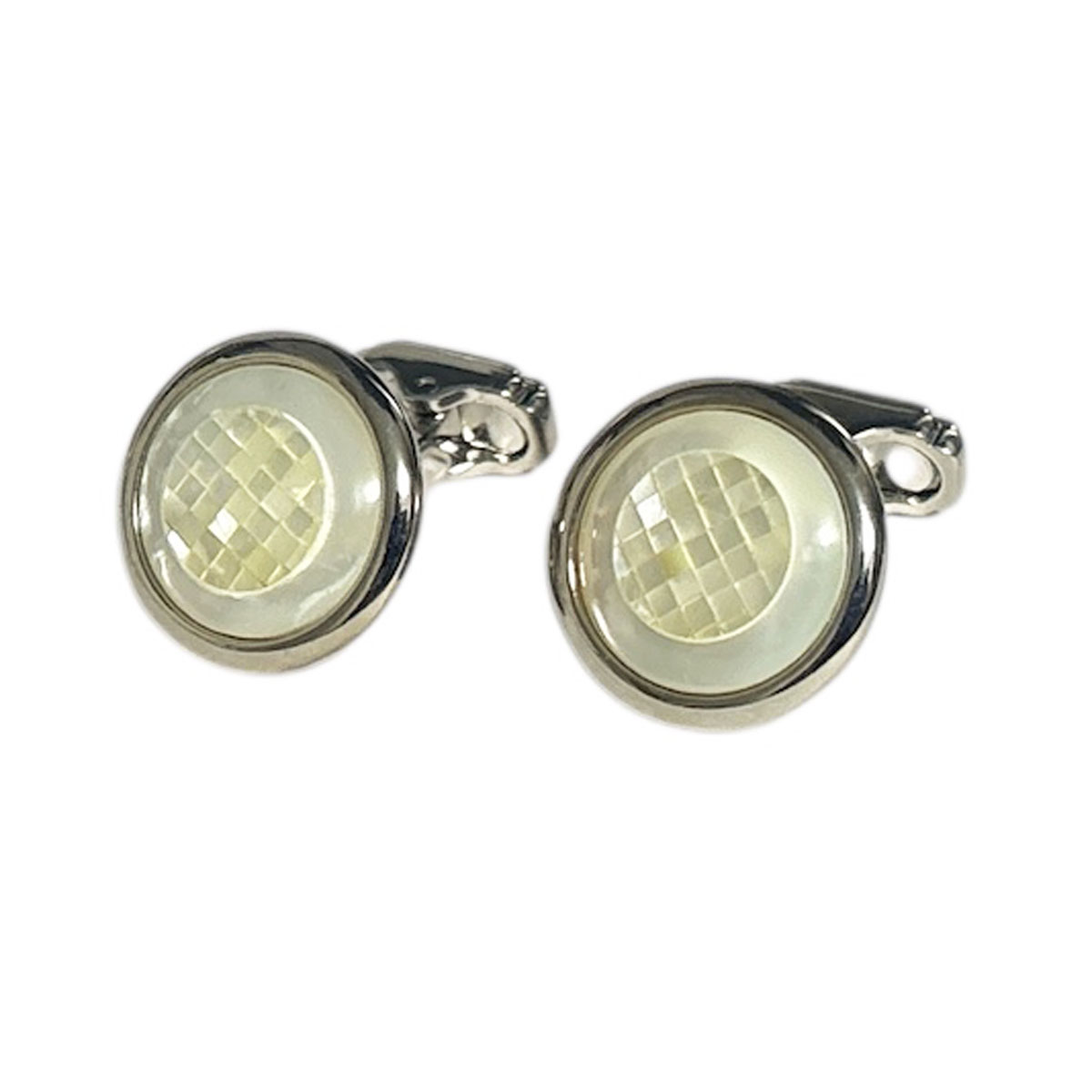 英国・トンプソンのカフスボタン。 マザーオブパールとブラックシェルでチェックデザインを 作り上げていますよ♪