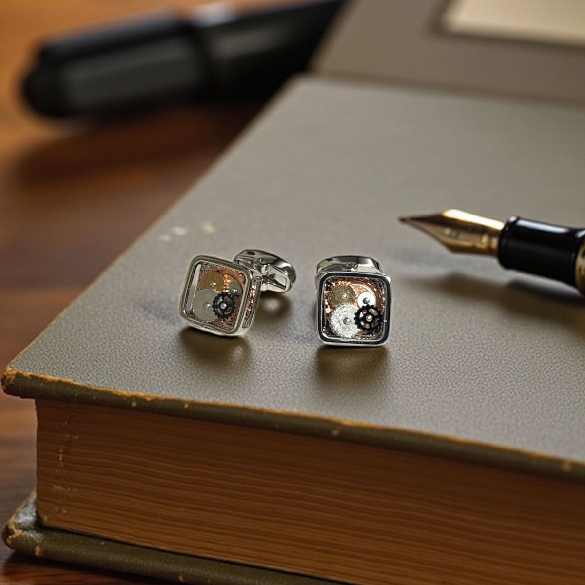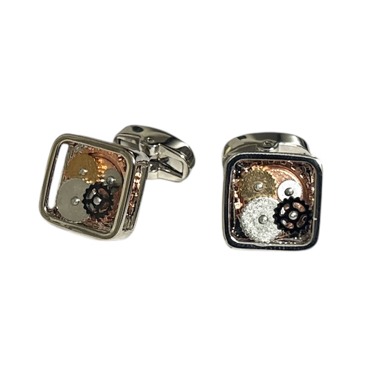 フレームの中に大小さまざまな ギアがデザインされたカフスボタン 袖口のアクセントにおすすめですよ♪