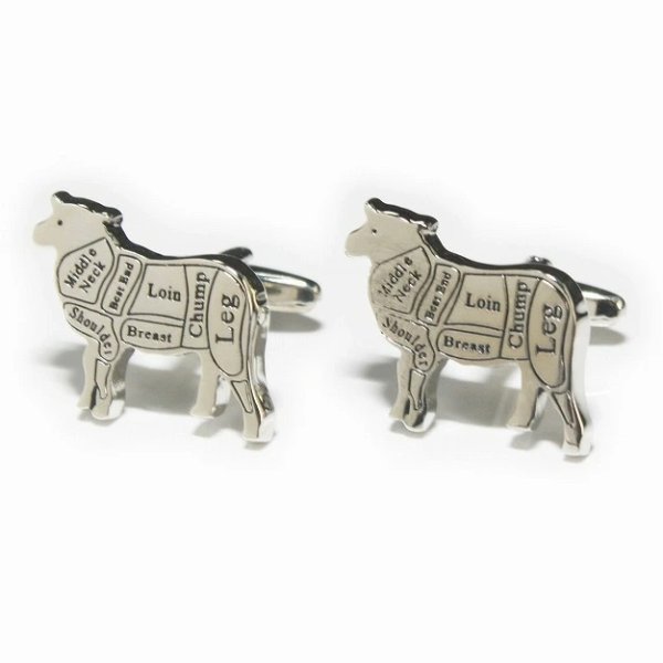 牛肉の部位を記載した牛モチーフの ユニークなカフスボタン。 お肉に詳しくなっちゃいますよ ベースカラー-シルバー 素材-真鍮(brass) サイズ-25x16mm