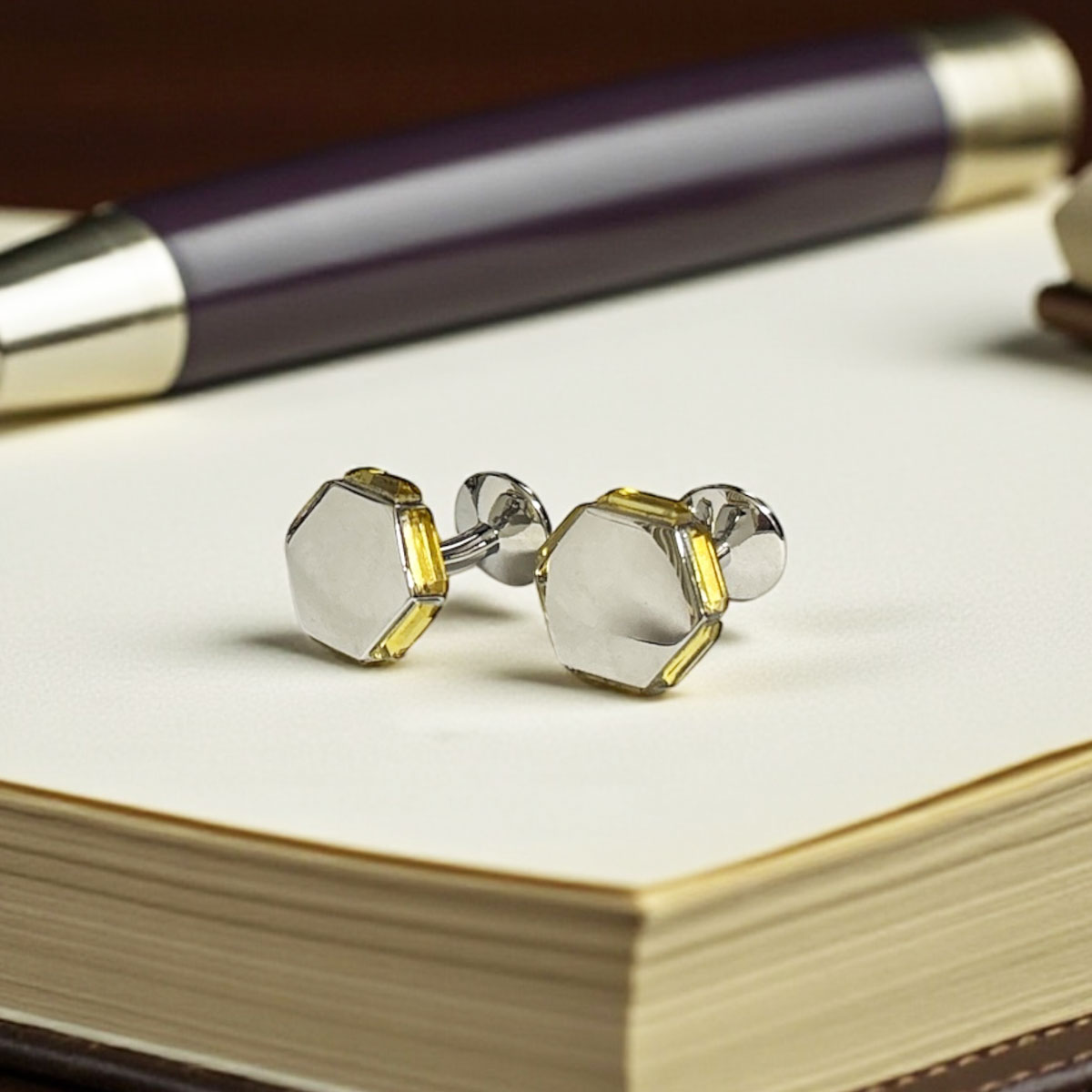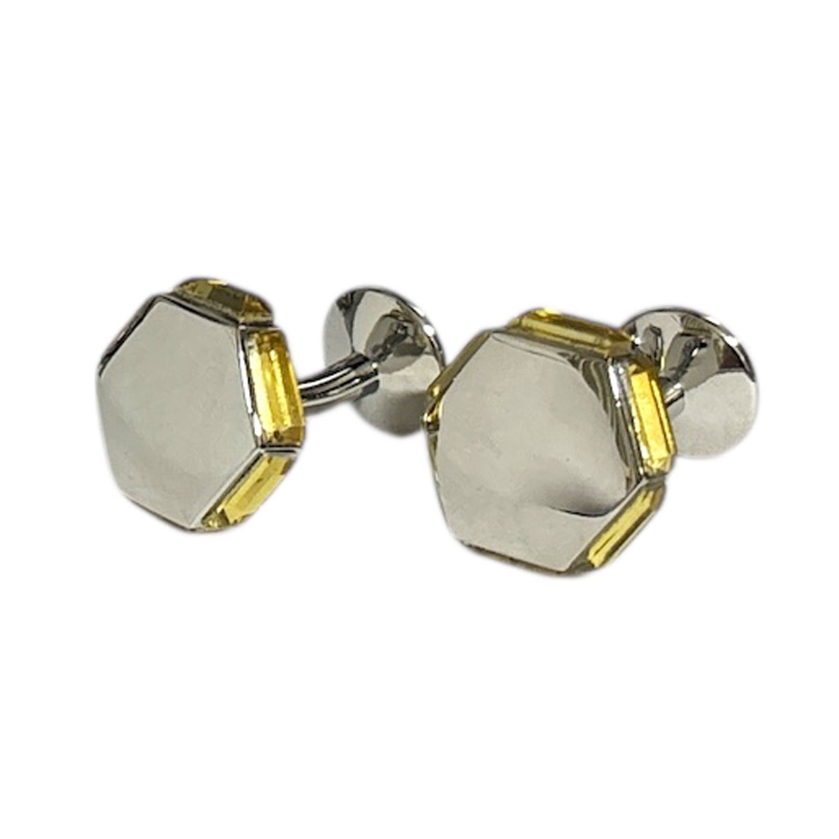 ヘキサゴンシェイプのカフスボタンの エッジ部分にアメジストクリスタルを 配置したゴージャスなカフスボタン ベースカラー-シルバー 素材-真鍮(brass) サイズ-15x15mm