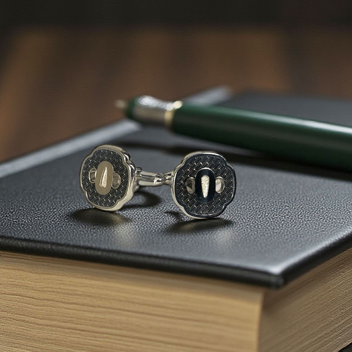 SWANK の刀の鍔の部分をモチーフにした 青いデザインのカフスボタン。 和のデザインがお洒落ですよ ベースカラー-シルバー 素材-真鍮・ロジウムコーティング サイズ18x16mm