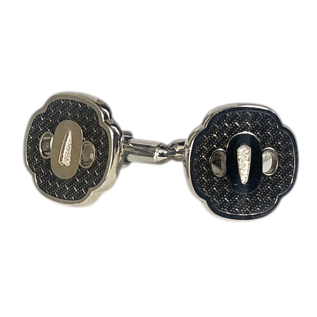 SWANK の手裏剣をデザインした 黒いデザインのカフスボタン。 和のデザインがお洒落ですよ ベースカラー-シルバー 素材-真鍮・ロジウムコーティング サイズ26x26mm