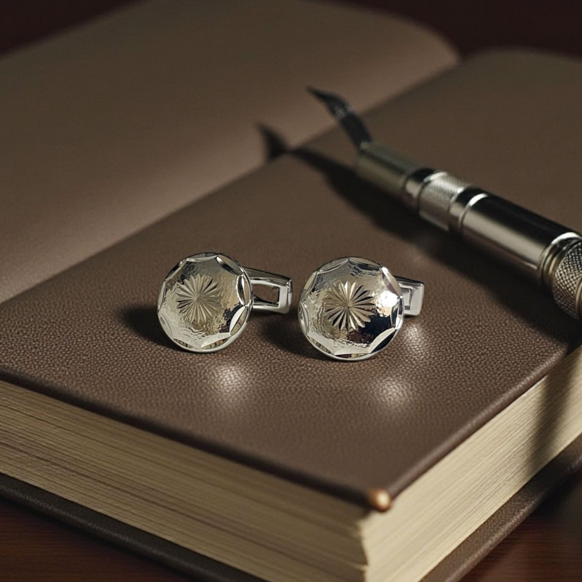 シャイニーカットが施された スクエアータイプのカフスボタン。 シンプルで使い勝手が良いですよ。 ベースカラー-シルバー 素材-真鍮(brass) サイズ-18x18mm