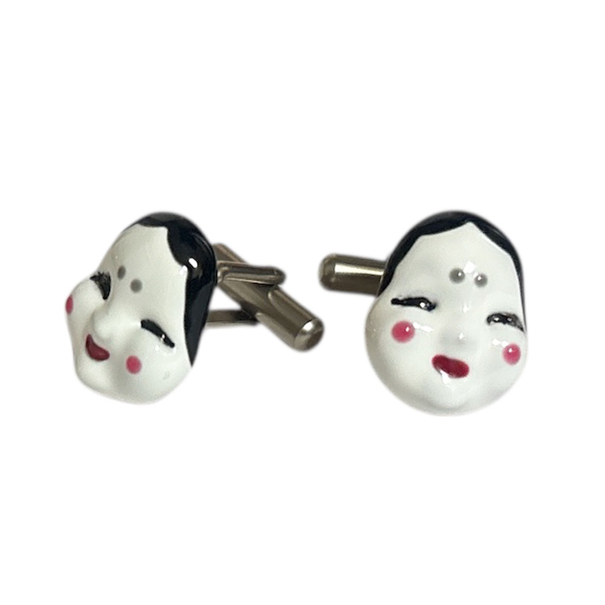 「おかめ」を、気品あるカフスとタイピンに仕立てました。