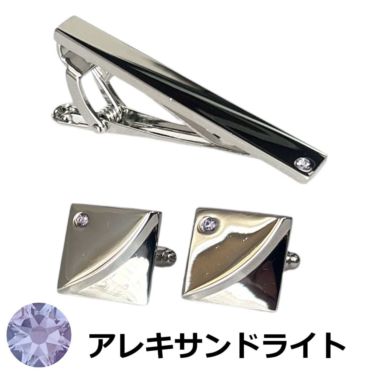 6月の誕生石カラー アレキサンドライトクリスタルガラスカフスボタン・ネクタイピンセット